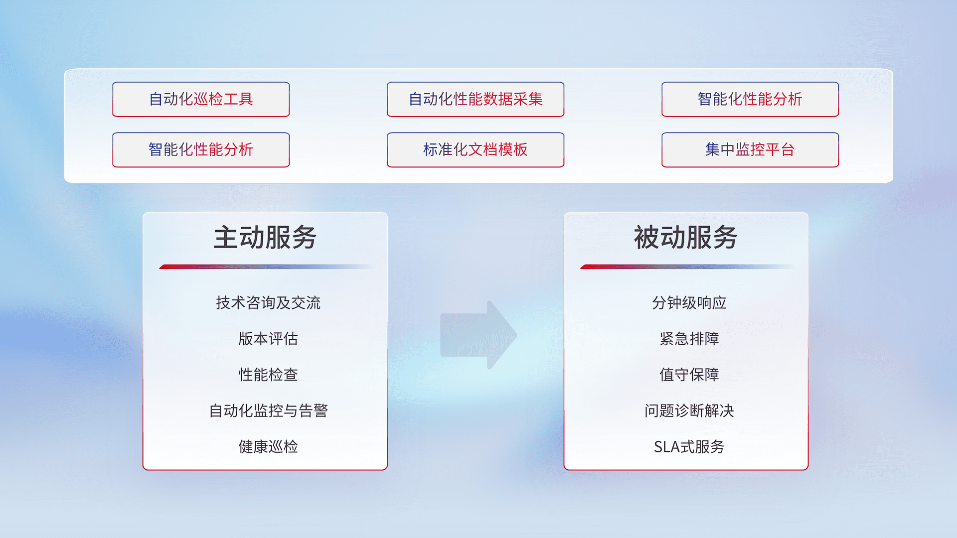 智能化工具和标准化文档,,,保障服务质量,,,提供主动服务(包含技术咨询、、版本评估、、、、性能检查、、、自动化监控与告警、、健康巡检)和被动服务包含(分钟级响应、、、、紧急排障、、、、值守保障、、、、问题诊断解决、、、、SLA服务)。。。。